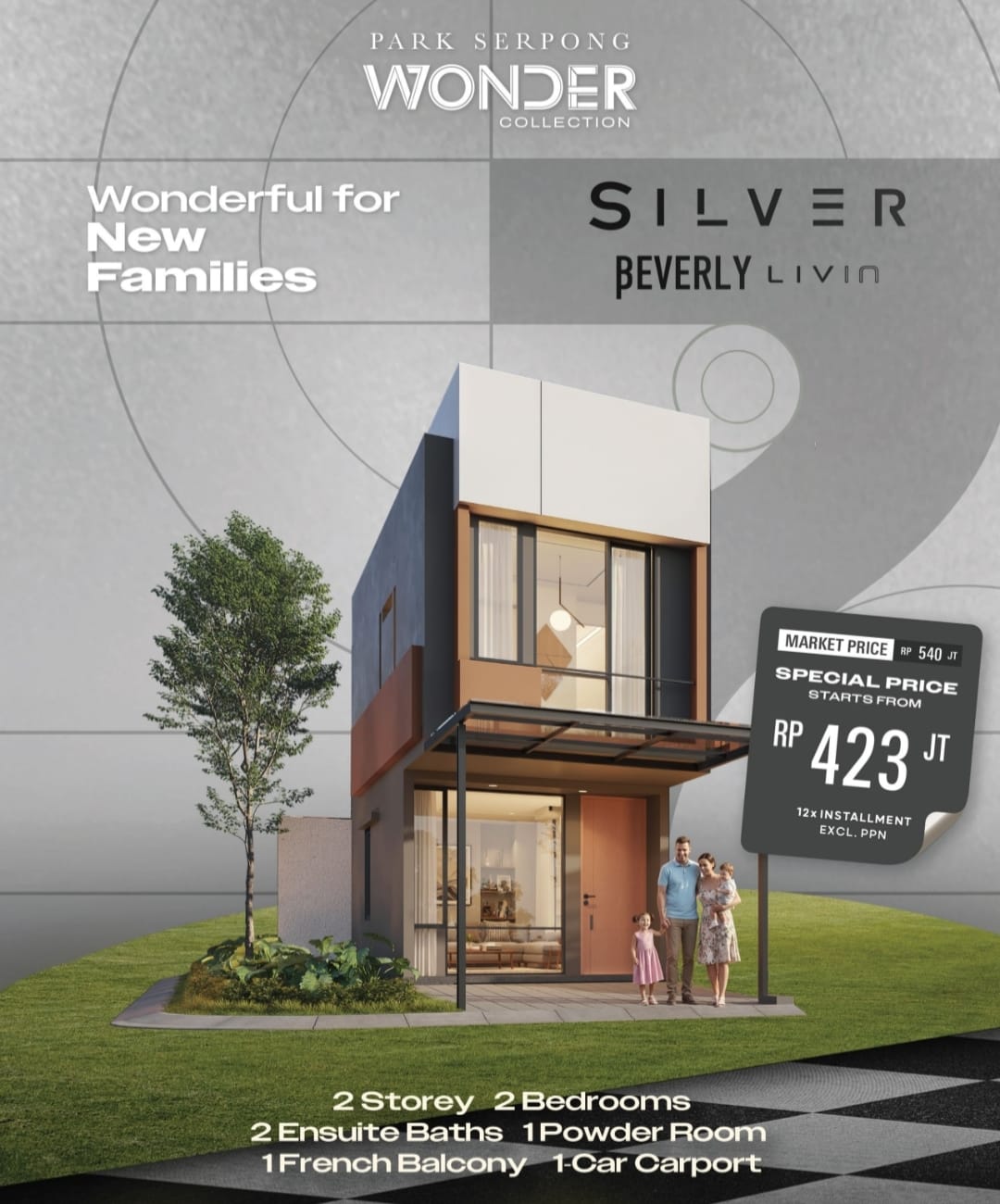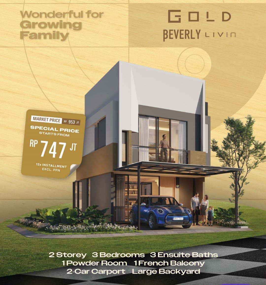 Rumah 2 lantai dengan design modern & estetik. 3 kamar tidur & 3 kamar mandi dalam memberikan kenyamanan maksimal bagi seluruh keluarga anda. Juga tersedia Powder Room untuk kenyamanan tamu. Lengkap dengan Backyard luas sebagai Resort pribadi untuk keluarga. Carport untuk 2 mobil.